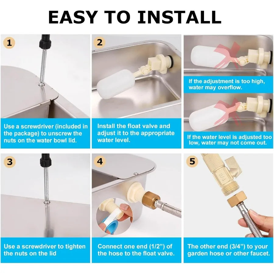 The package comprises a bowl, a float valve, and a braided hose (3.2 ft long) with 1/2" pipe threads to 3/4" GHT. Proper installation ensures a leak-free, reliable water source for your pets.