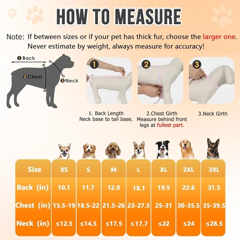 Available in 7 sizes from XS to XXXL, suitable for dogs weighing 5 to 88 pounds. Please measure your pet’s back length, neck girth, and chest girth, and refer to the size chart before purchasing. If your dog is between sizes or has thick fur, choose the larger size for a comfortable fit.